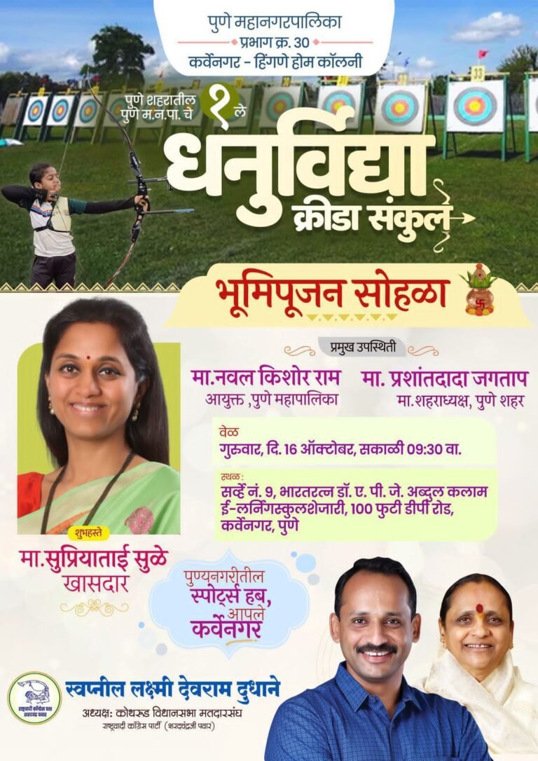 पुणे/ कोथरूड : कर्वेनगर प्रभागात सुरू होत असलेला पुणे महापालिकेच्या पहिल्या धनुर्विद्या क्रीडा संकुलचा भूमिपूजन सोहळा येत्या 16 ऑक्टोबर रोजी...
