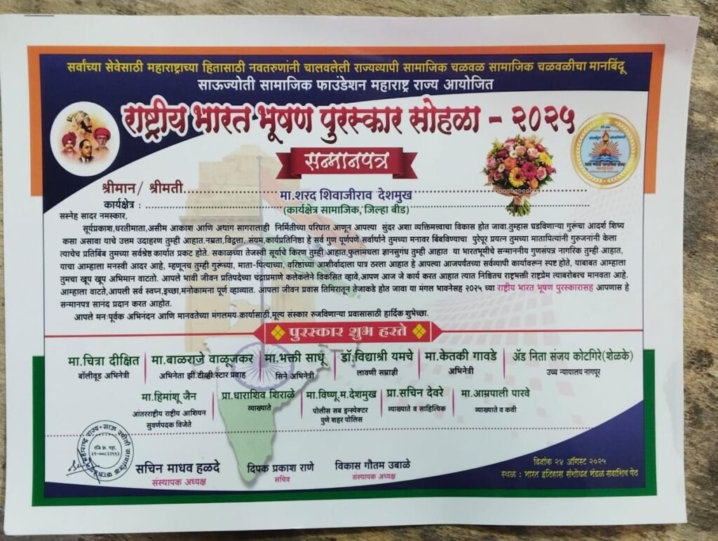 साऊ ज्योती सामाजिक संस्थेतर्फे आयोजित राष्ट्रीय भारत भूषण पुरस्कार सोहळा 2025 पुण्यातील भारत इतिहास संशोधन मंडळ, सदाशिव पेठ येथे मोठ्या उत्साहात पार पडला.